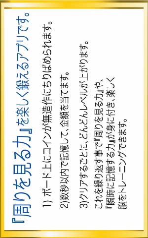 ちりばめられたコインを数秒で把握して金額を当てる、周りを見る力を鍛える脳トレアプリです。